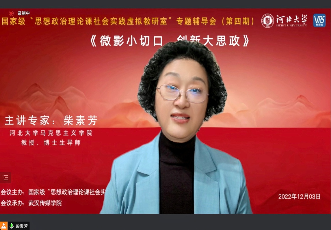 为主动适应信息化时代青年学生的多样化需求,赋予我们思政课高质量发展新动能,构建好“大思政”格局,12月3日上午,我们马克思主义学院承办了国家级“思想政治理论课社会实践虚拟教研室”第四期专题辅导会,会议在教育部虚拟教研室客户端(B版)举行。主讲专家为国家级一流本科课程《思想政治理论课社会实践》负责人、国家级虚拟教研室《思想政治理论课社会实践虚拟教研室》负责人、教育部首批“全国高校思政课教师年度影响力人物”、全国高校思政课名师工作室负责人柴素芳教授,报告题目为《微影小切口 创新大思政》。我们全体思政课教师参加会议,会议由罗晶晶老师主持。