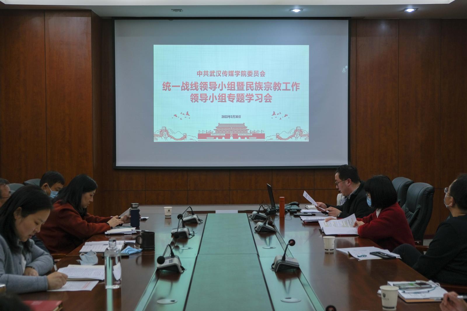 (武传新闻网讯)3月30日下午,我们召开统一战线工作领导小组暨民族宗教工作领导小组专题学习会议。党委书记郭新力、党委副书记宗微、党委常委赵秀丽、张燕明、李道霞等领导小组成员参加会议。会议由党委副书记、纪委书记蒋萦同志主持。
