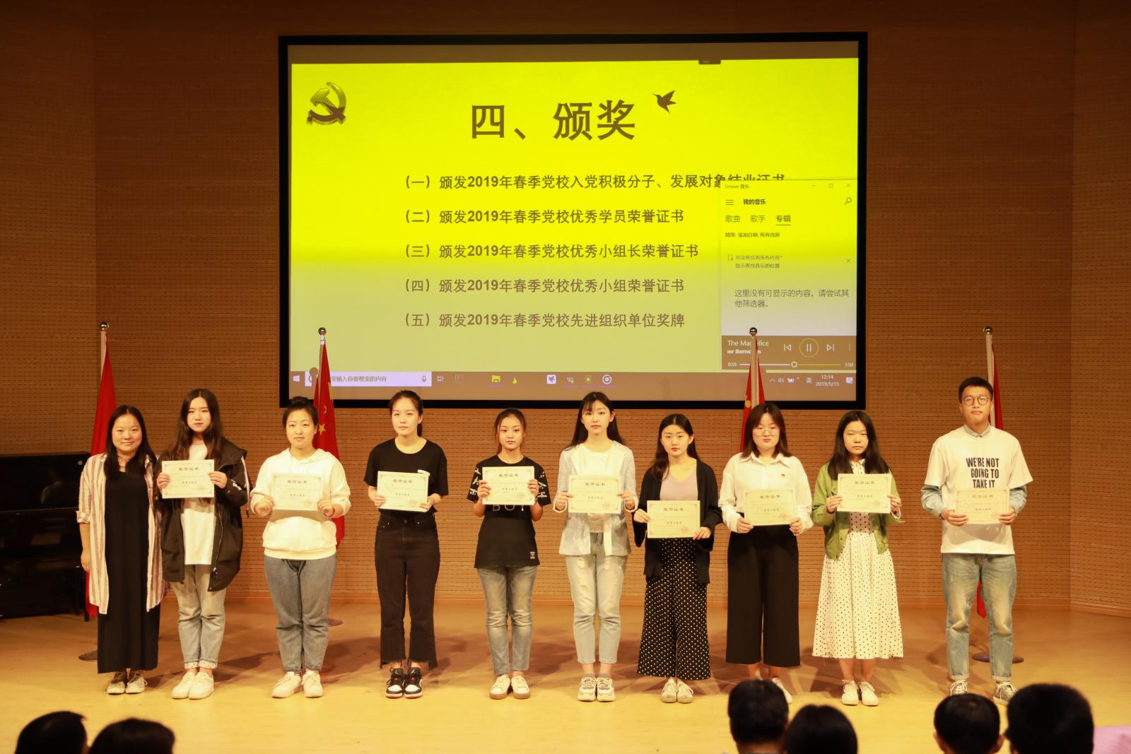 党委工作部副科长戚盼姣宣读2019年春季党校表彰文件。本期党校培训班共评出35名优秀学员、24名优秀小组长、17个优秀学习小组、新闻传播学院党总支、人文与艺术学院党总支共2个先进组织单位。学工处处长张燕明和各院党支部书记、直属支部书记为优秀代表颁奖。