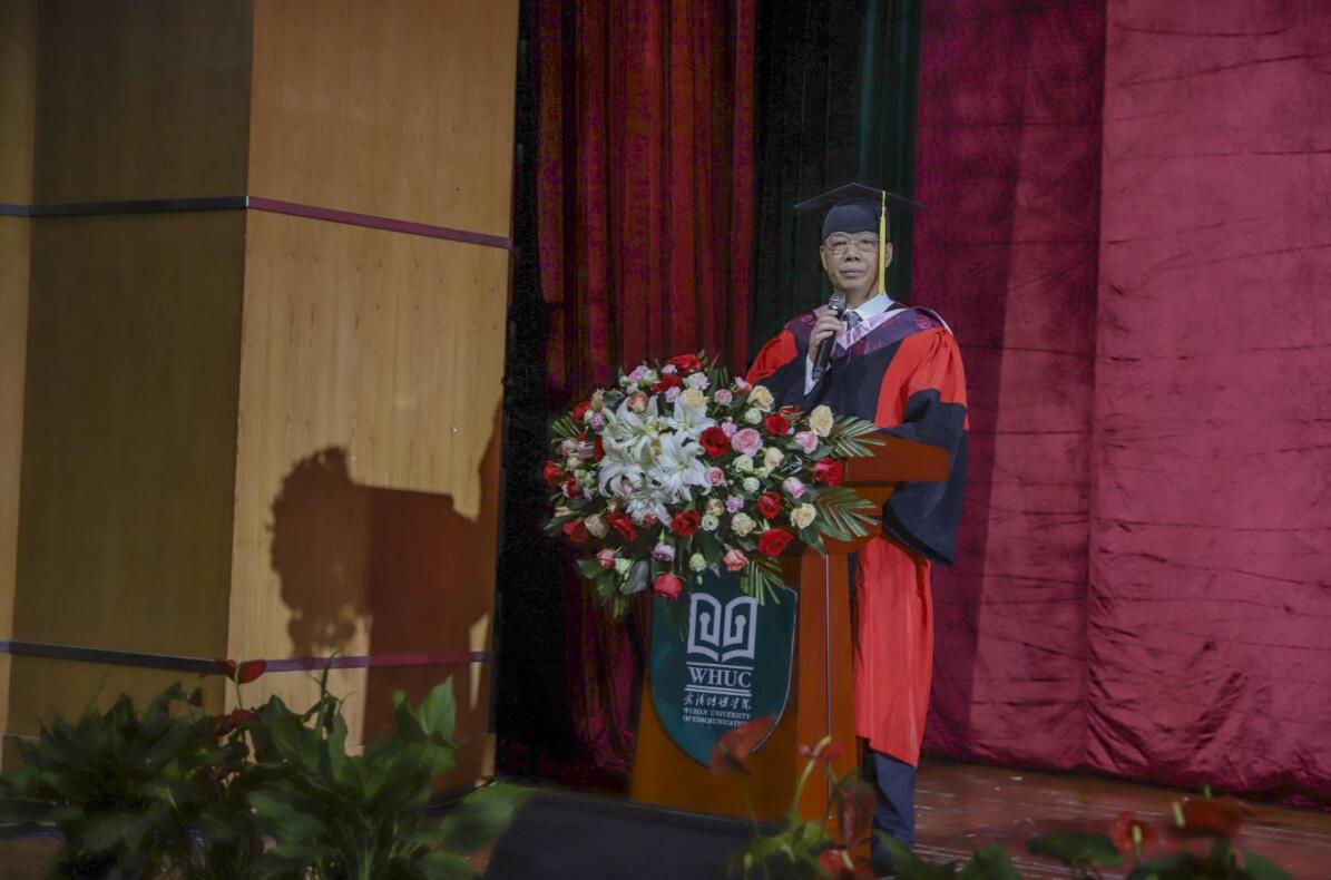 奏国歌后,党委书记郭新力在毕业典礼上致辞。他首先总结了本届毕业生四年来取得的成绩:22人成功考研或出国深造,通过努力考进武汉大学、华中科技大学、英国利兹大学、澳大利亚蒙纳士大学等国内外知名高校;入职事业行政单位,投身“三支一扶”岗位,考取援藏干部,还有部分学生选择了自主创业。他寄语毕业生要牢记博雅、崇实、弘志、拓新的校训,不断升华人生境界,以更高的要求投身工作岗位。