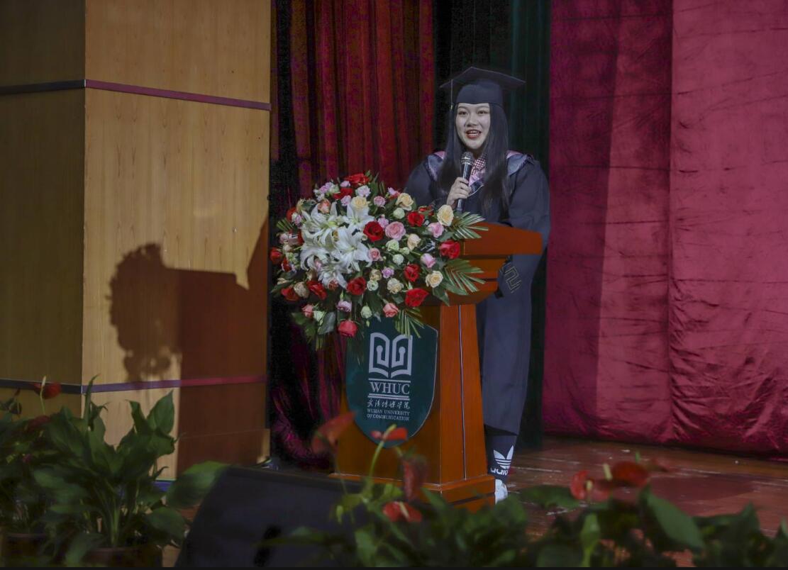 2015级新闻传播学院的梅兰作为毕业生代表上台发言。她表示,经历大一的纯真年代,走过大二的慷慨激昂,告别大三的紧张忙碌,来到今日大四的依依别离,明白了什么叫做竭尽所能,也创造了一个更有意义的人生。临行之际,她对老师们表示感谢,祝愿母校的明天更加灿烂辉煌,同时也为自己是武传人感到骄傲。