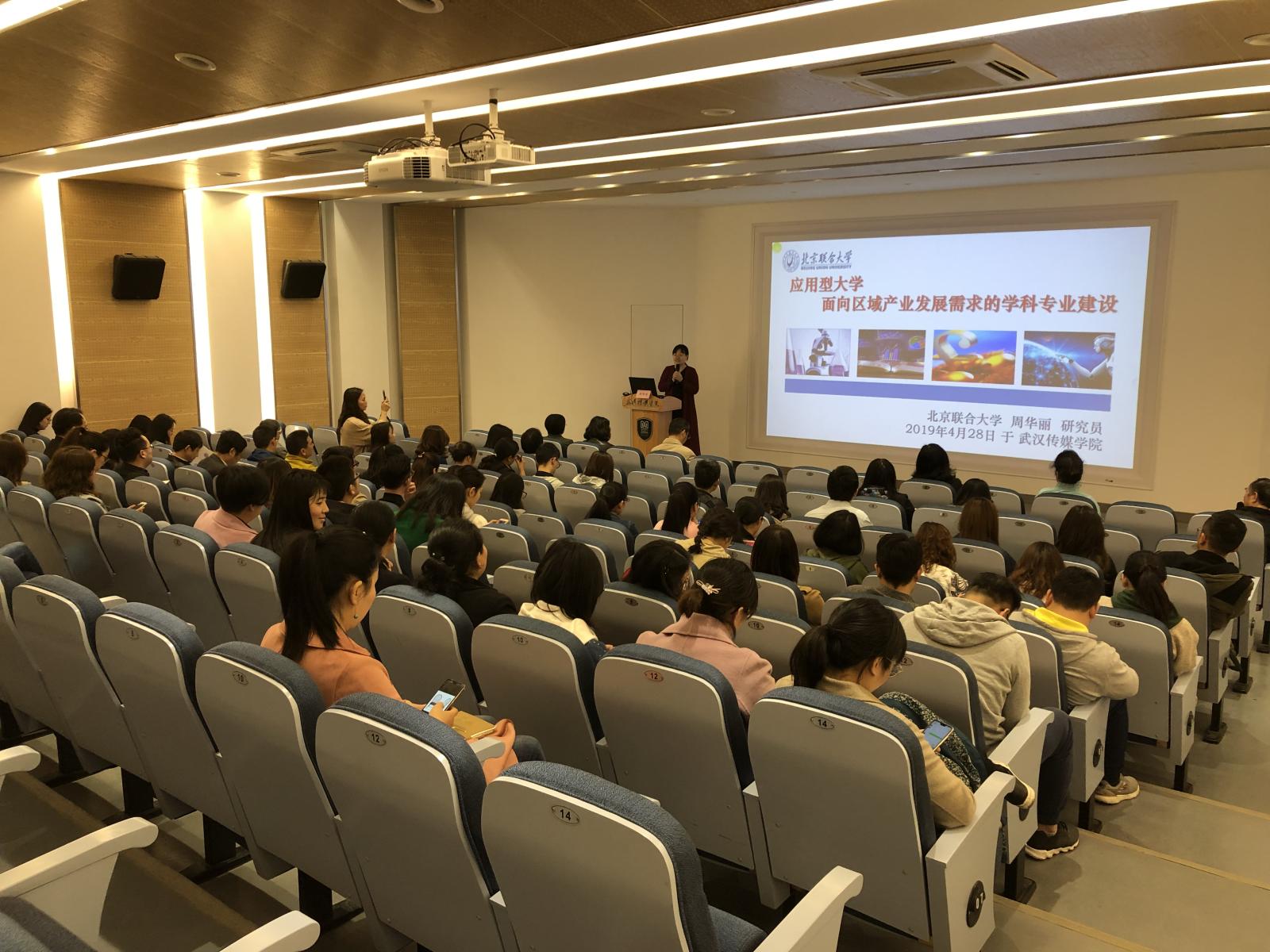 武传新闻网讯 4月28日下午,我们举办了“应用型大学面向区域产业发展需求的学科专业建设”专题讲座,邀请北京联合大学师范学院科研处处长周华丽教授主讲。行政职能部门中层干部、各学院院领导、教研室主任共70余人参加,校长助理、人事处处长姚晓菊主持。