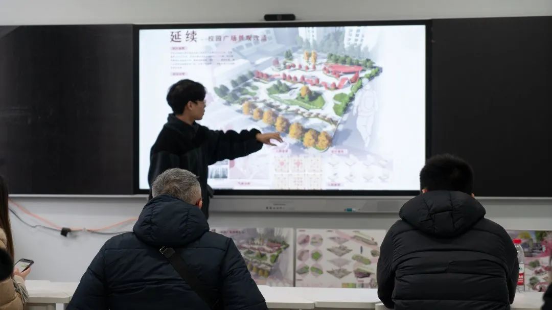 本次交流活动,我们学生的8幅作品以校广场景观改造作为设计主题。同学们依次阐述了自己的设计理念和方案,并先后与Logan进行了学习、交流。作为有着丰富经验的设计师,Logan的点评简洁而精准,对于以梅花为主要设计元素的作品,他认为应该留有更多空间,不用铺满整个景观设计;对于以钢琴键为主要设计元素的作品,Logan首先对其设计理念表示赞同,并指出,作品的呈现如果能与琴声相结合则会更加生动,整个交流过程让我们学子收获颇丰。