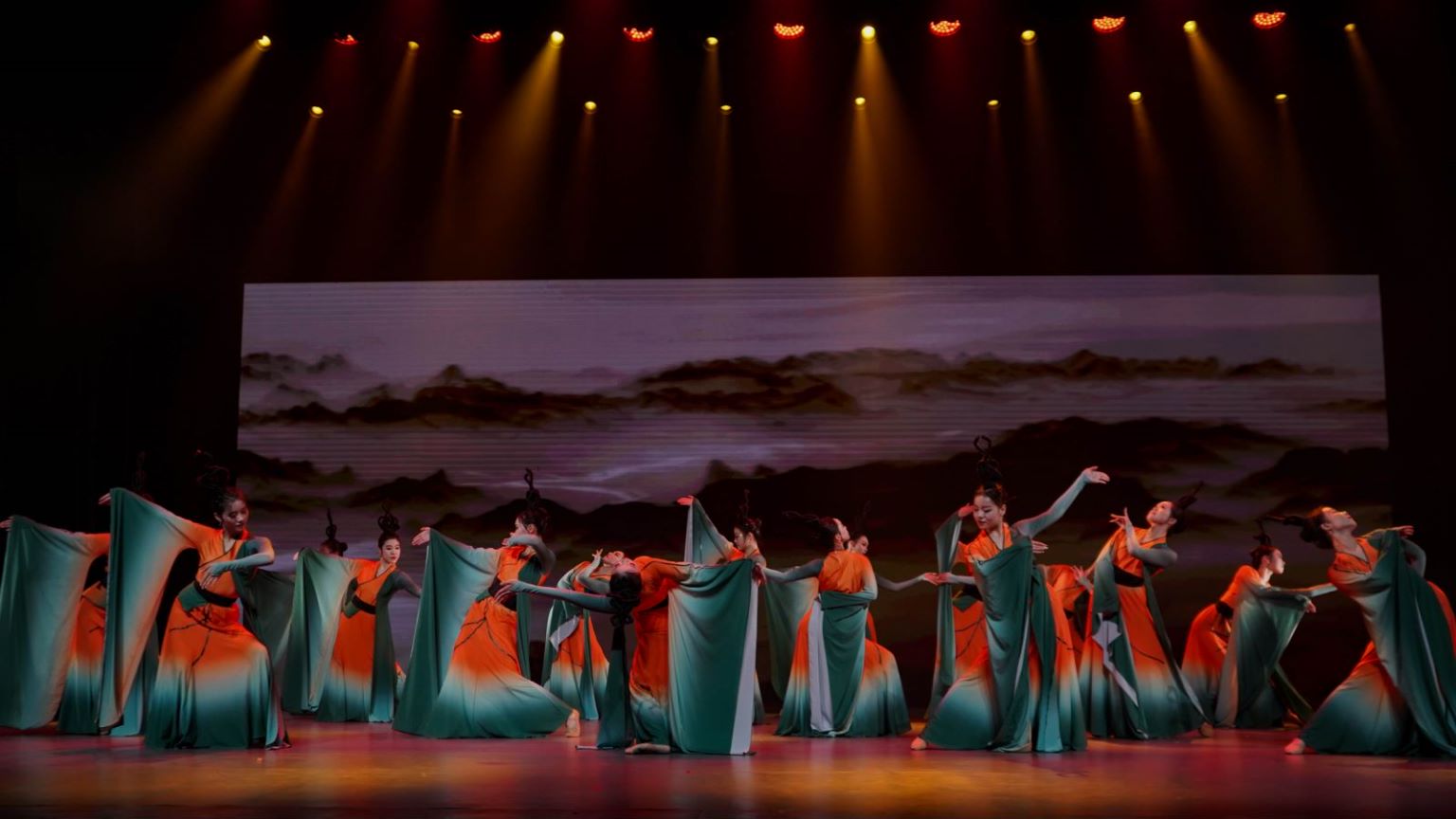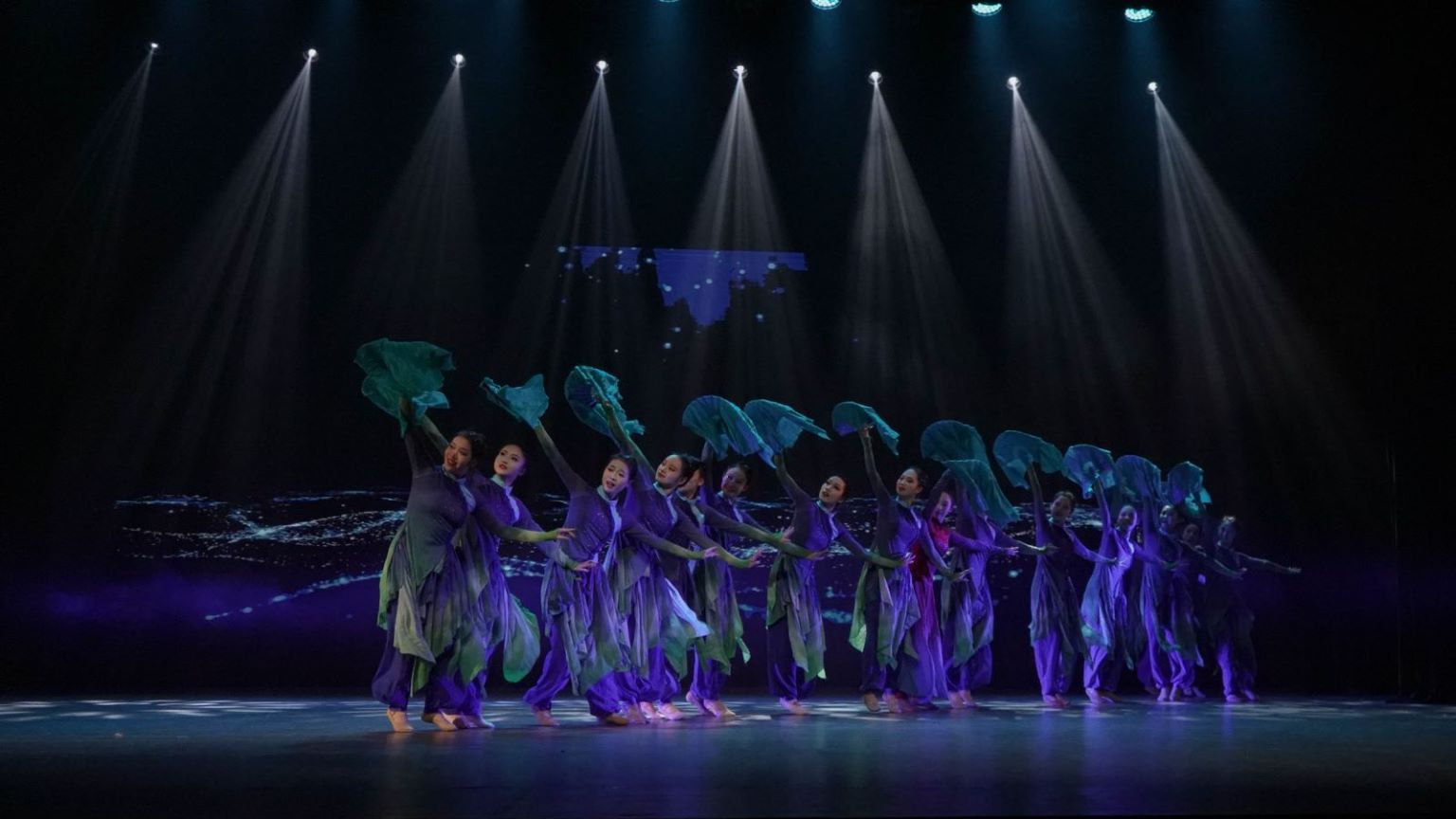 该场舞蹈借台上女演员们的形象与身段尽可能地展现“河流”连绵不断、蜿蜒流向、所处地理位置的特征;更采用扇子作为道具助力演员肢体动作的延伸,以便实现与“大河”动势状态的比拟。因此,在舞蹈演绎过程中,舞者们队形调度与身体的旋转不仅饱含了编舞人的巧思与遐想,所营造出的流动感,更是向现场观众传达出了“大河”历经时光流逝后生机盎然,与人们相互孕育后天人合一的感觉和意境。