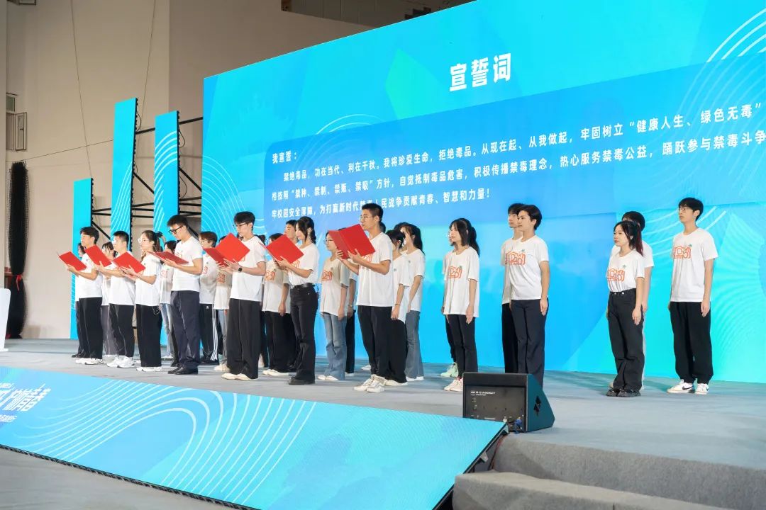 最后,我们受邀与江汉大学、武汉科技大学、武汉理工大学、湖北警官学院、湖北大学知行学院等37名学生代表组成了高校禁毒宣传志愿者团队。而设计学院21级视觉传达专业学子苏子骏作为领誓人,带领我们志愿者方阵学生上台宣读禁毒倡议书并作禁毒倡议宣言。