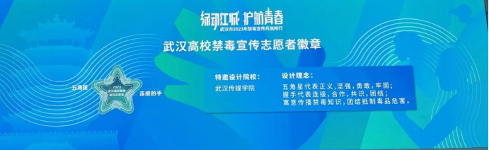 其中,武汉高校禁毒志愿者徽章也在现场正式发布,而徽章设计则是由我们设计学院视觉传达设计专业教师蒋夕欧、付静、戴承怡带领学生阳思远、熊雅莉、朱正楠、陈思、苏子骏、左思露、陈雨娟、牛沁芸,绘制50余稿方案创作表现的,是以五角星代表正义、坚强、勇敢、牢固;握手代表连接、合作、共识、团队。徽章设计寓意传播禁毒知识,团结抵制毒品危害。现场禁毒宣传月高校行活动志愿者服装均由我们“只是工作室”团队创作完成。