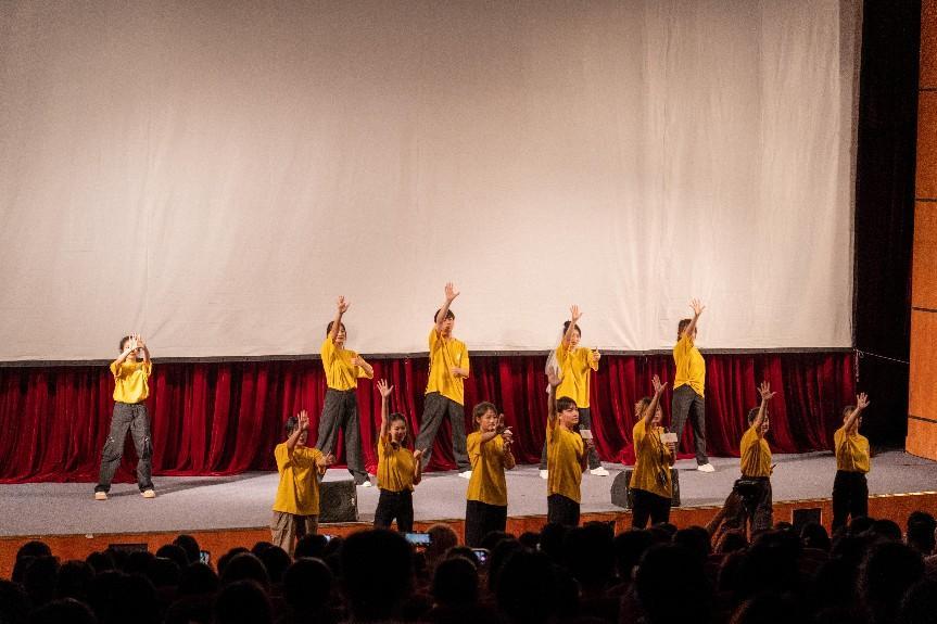 开场前,我们春秋创意工作室的工作人员登台表演了一段婚礼的宣誓仪式,男女主人公相对而立,注视对方,同时伴随着电影主题曲《爱》的倾情演唱及手语舞的表演将观影氛围拉入高潮。