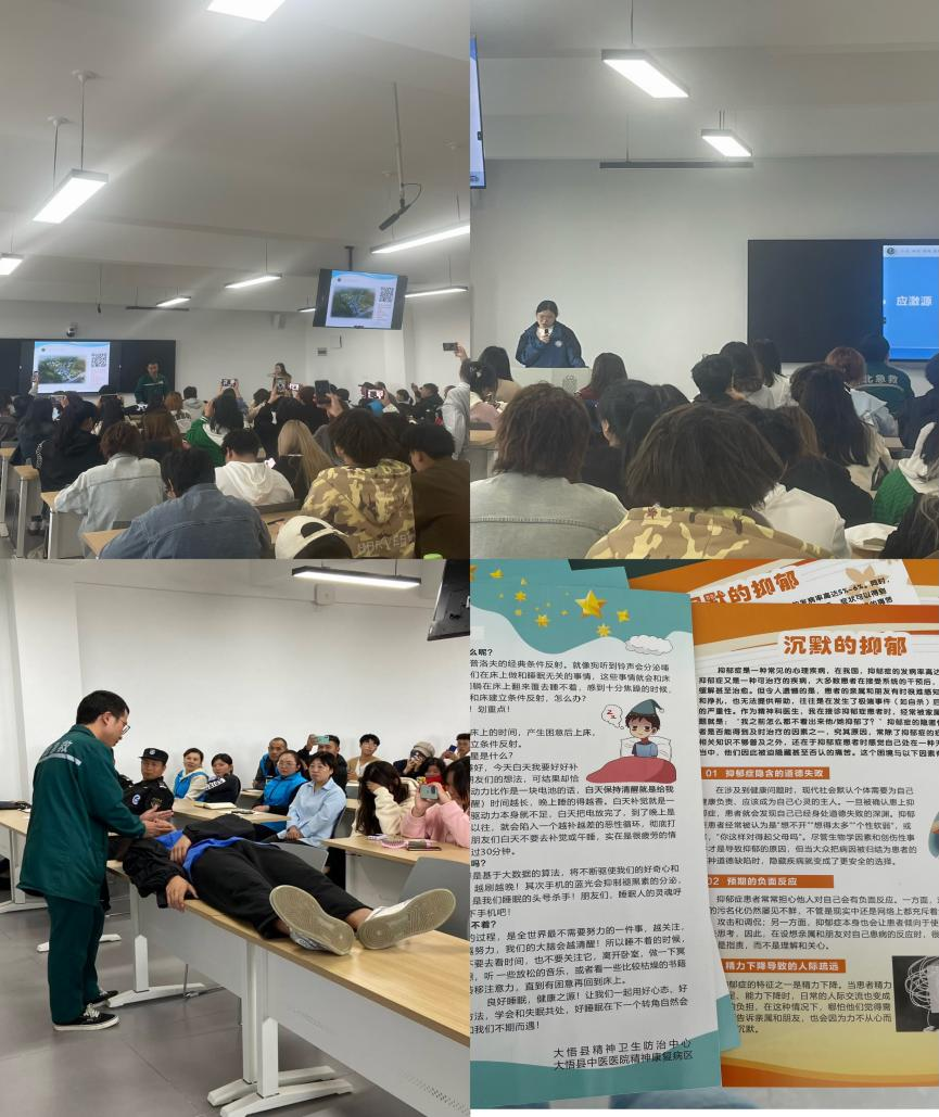 讲座伊始,大学生心理健康教育中心主任李霞向大家讲述了“世界精神卫生日”的由来,介绍了本次讲座的内容安排。本次讲座邀请了大悟县中医医院精神科和急诊医学科医生进行科普知识宣讲,精神科医师金艳艳进行了《大学生应激相关障碍》的科普,讲解了大学生应激相关障碍产生的原因以及一些应对策略。急诊医学科乐权安医生为师生们开展了《大学生安全急救常识》的宣讲,从“现场救护原则”谈起,详细地普及了现场救护的实施步骤和简易处理方法。理论讲解结束后,还进行了心肺复苏的现场演示,让大家更加深刻地了解和掌握了应急救护知识。讲座的尾声,医生们还为现场的师生发放了宣传折页,进一步宣传身心健康理念,普及精神卫生知识。