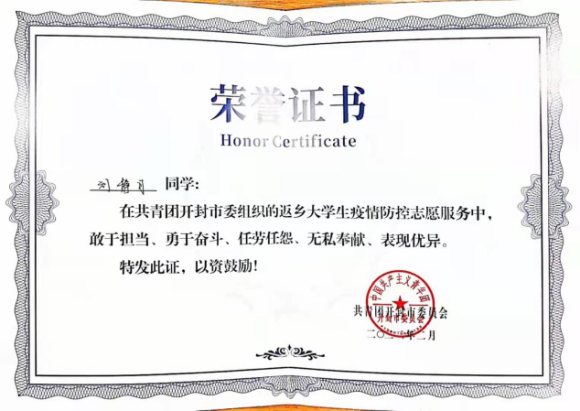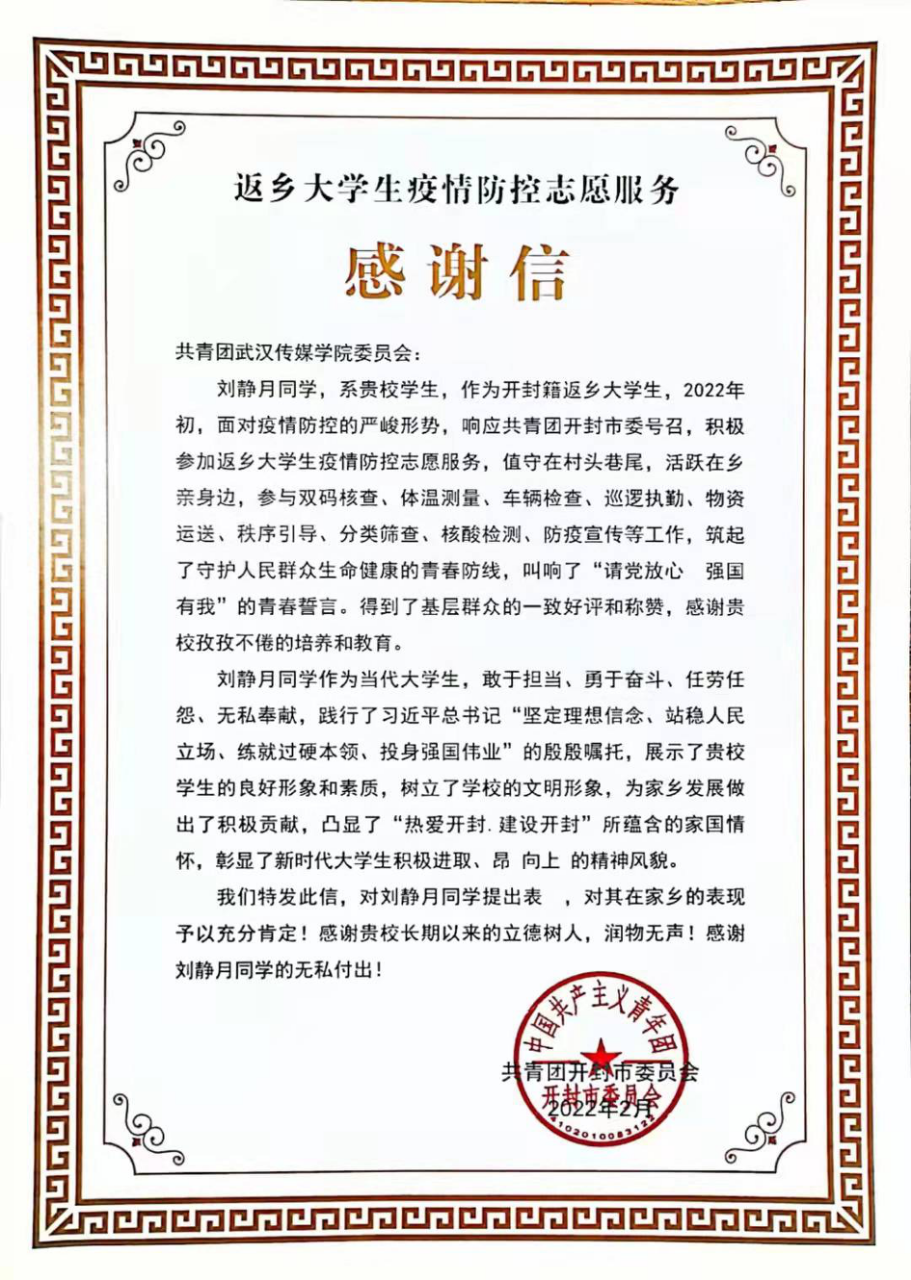 (武传新闻网讯 记者 石佳 )“感谢刘静月同学为家乡做出了积极的贡献,凸显了‘热爱开封,建设开封’所蕴含的家国情怀,彰显了新时代大学生积极进取,昂扬向上的精神风貌”。这是来自共青团开封市委发来的一封感谢信,对我们电影与电视学院广播电视编导B2103班的刘静月同学以高度的热情和激情,积极投身家乡疫情防控工作的志愿服务精神给予了充分肯定。
