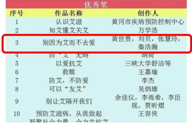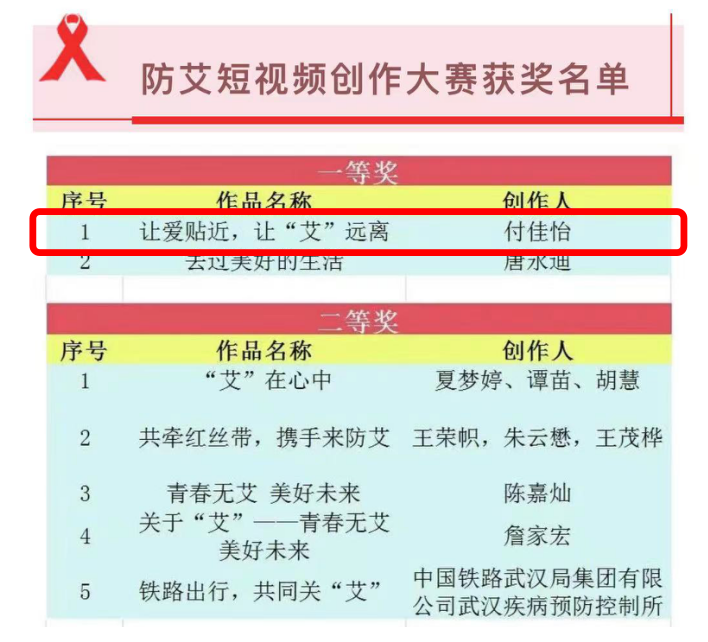 本次大赛由湖北省疾病预防控制中心、湖北省艾滋病防治协会主办,经过艾滋病防治、媒体、宣传等领域专业评委的认真评选,最终评选出一等奖作品2个,二等奖作品5个,三等奖作品10个,优秀奖作品20个。