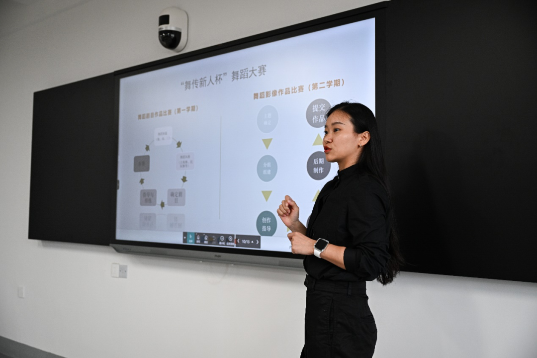同时,为营造良好的学习氛围,丰富新生们的大学生活,促进良好学风,我们舞蹈学专业教研室还将举办首届“舞传新人杯”舞蹈大赛。现场由教师夏可馨、李翠颖分别介绍了舞蹈剧目作品比赛、舞蹈影像作品比赛两大板块的赛事安排及要求,鼓励同学们发挥自己的热情与创造力,积极参与本次比赛。