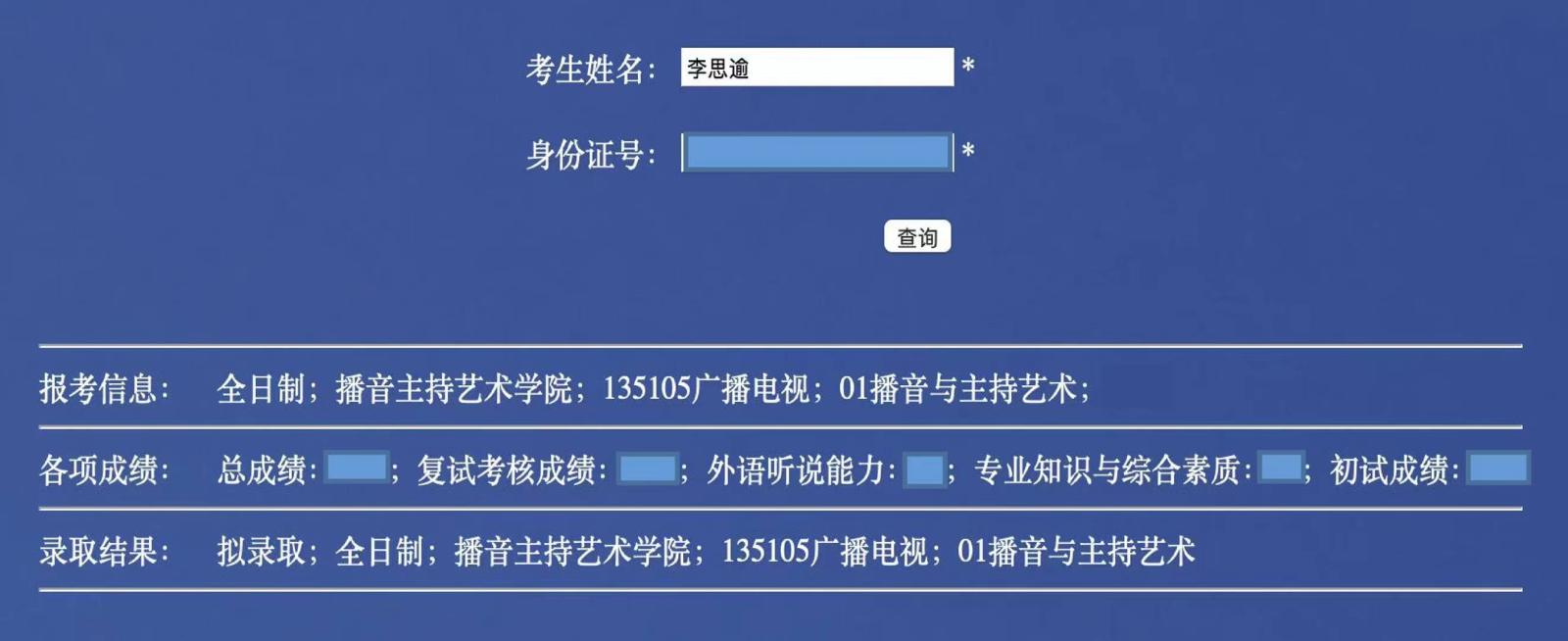 (武传新闻网讯 记者 卢诗源)近日,中国传媒大学播音主持艺术学院硕士研究生拟录取名单公布,我们播音主持艺术学院2017级学子李思逾,成功考取中国传媒大学广播电视专业播音主持与艺术方向。