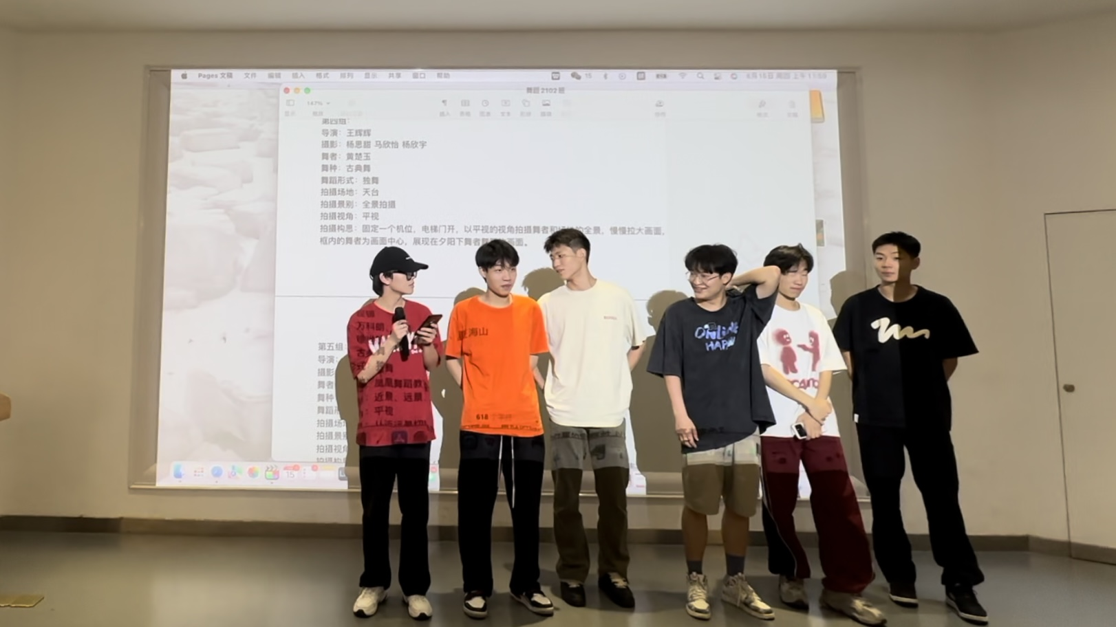 同时,作为舞蹈专业的一门综合创作课程,《舞蹈影像》同样具备了自身的特殊性。首先是在课程的教学上,它不受空间的局限,除了需坐于教室内学习理论知识外,还将带领学生在校园内的任意场景中进行实际操作,从舞蹈影像的视角重新建立起学生对于环境和空间的认知与把握。其次便是在演示工具上也有所变化,从舞蹈道具向手机镜头转变,利用手机小巧、便携的特性,结合小成本创作方法带领学生打开舞蹈影像创作新思路。最后就是学生身份上的多重切换,由学生自行分组分工,模拟“剧组”创作模式,角色上,不仅限于舞者的表演身份,还将以导演、摄影、剪辑等身份进行创作学习。