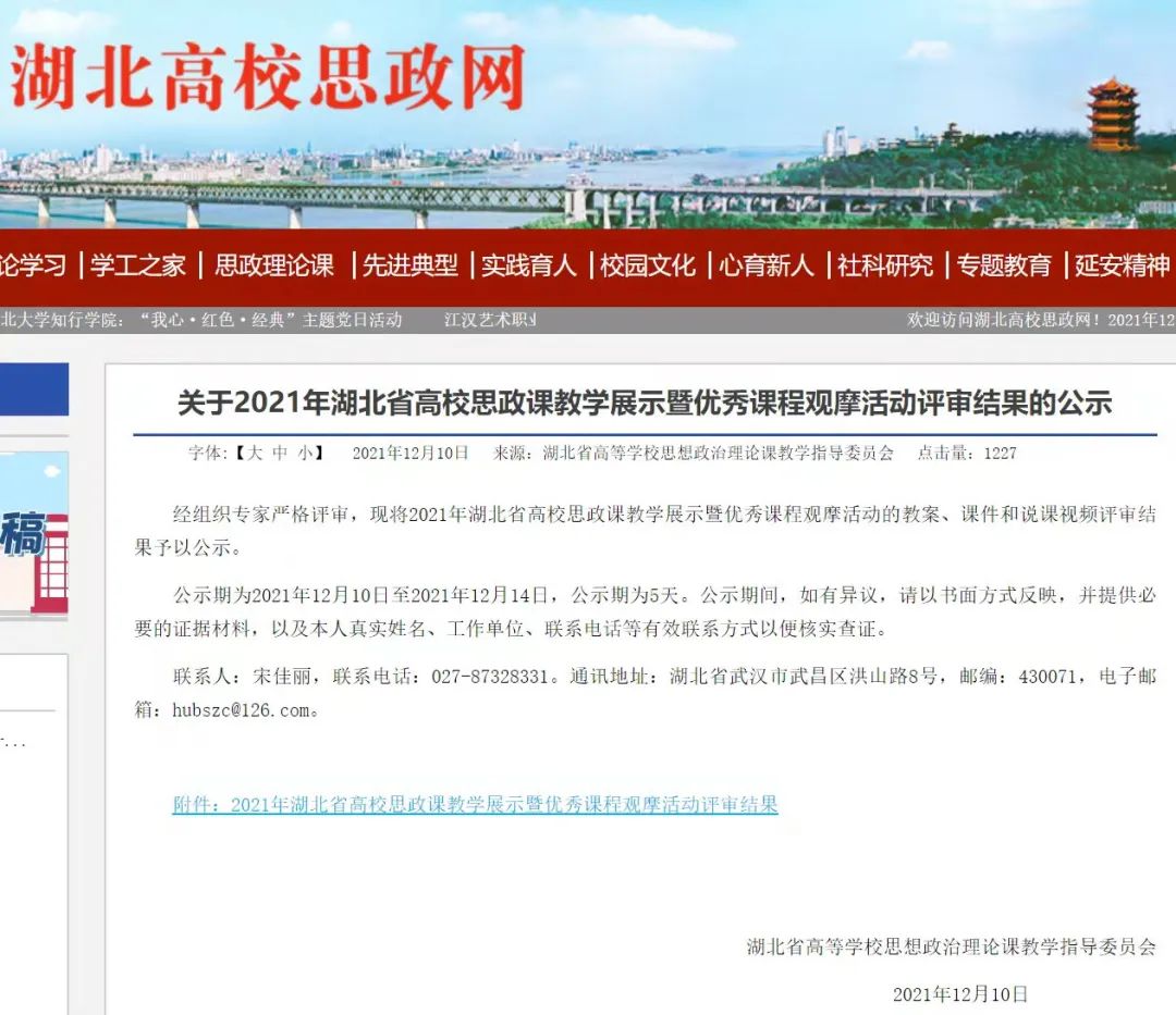 近日,从湖北高校思政网传来喜讯,在湖北省高校思政课教学展示暨优秀课程观摩活动中,我们思政课部罗金金、田爱玲两位老师喜获一等奖、三等奖。
