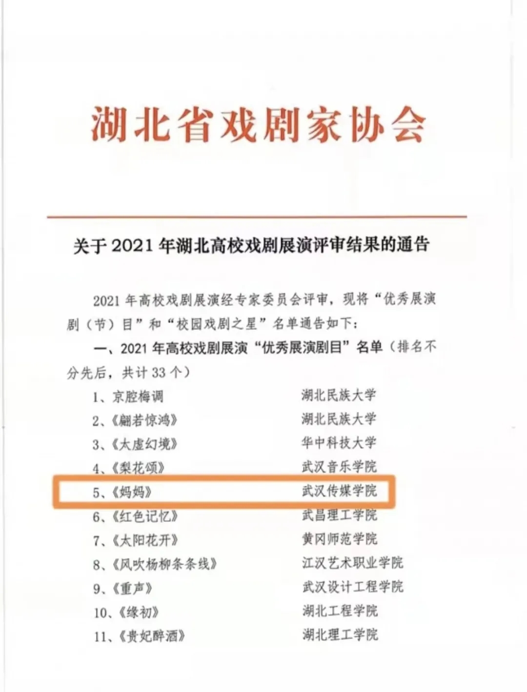 12月08日,2021年湖北省高校戏剧展演评审结果正式公布,由我们选送人文与艺术学院“18级音乐学”师生自主原创的原本性音乐戏剧《妈妈》,荣获“优秀展演剧目”奖。这是我们连续三年在湖北高校戏剧展演活动中获得殊荣。