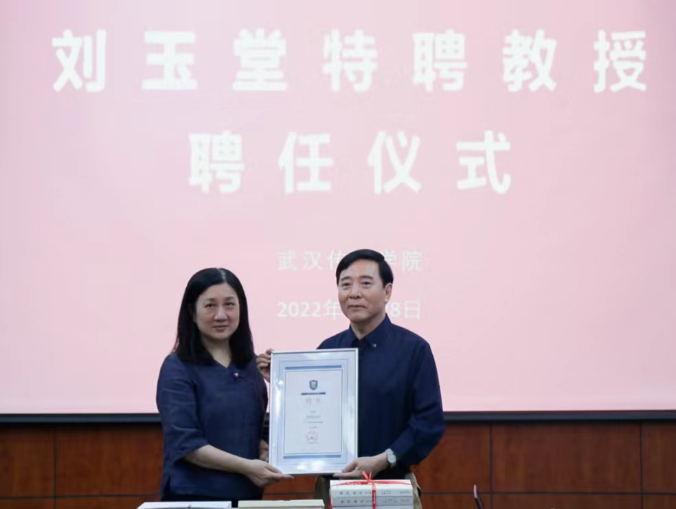 此外,我们聘请刘玉堂为我们特聘教授。常务副校长宗微为刘玉堂教授颁发聘书。