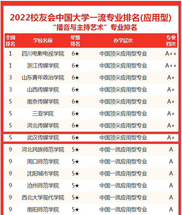 其中,播音与主持艺术专业荣得2022中国六星级应用型专业(6★),入选中国顶尖应用型专业行列。播音与主持艺术专业分为播音主持、口语传播与双语播音三个专业方向,培养具备播音主持艺术、新闻传播学等多学科的知识与能力的复合型和应用型专门人才。同时该专业也是湖北省重点(培育)本科专业之一。