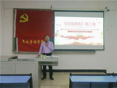 (武传新闻网讯)2021年4月20日晚17:00,为加强我们中共党员、中共预备党员、发展对象和入党积极分子对习近平新时代中国特色社会主义思想更深刻的学习,文化管理学院在5201教室开展了“学习《习近平谈治国理政》第三卷”专题党课。本次党课由文化管理学院党总支书记张爱军主讲。