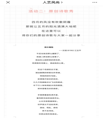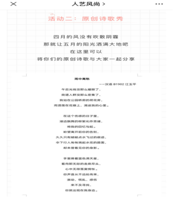 人文与艺术学院开展了以“‘疫’情不‘抑’爱”为主题活动,通过“说说心理话”、“原创诗歌秀”和“墙墙有话说”三个活动,帮助学生释放心理压力,以积极心态迎接美好未来。