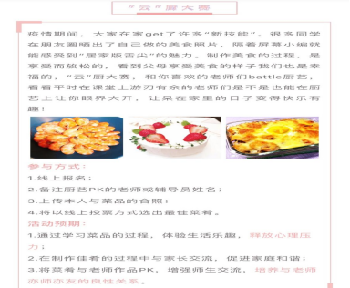 设计学院开展的心理健康月系列活动分为“‘云’厨大赛”,“动物手指健康操”,“清洁能手”三个部分,让同学们体验生活乐趣,释放心理压力,并通过整理房间、打扫卫生,收获内心的成就感及愉悦感。