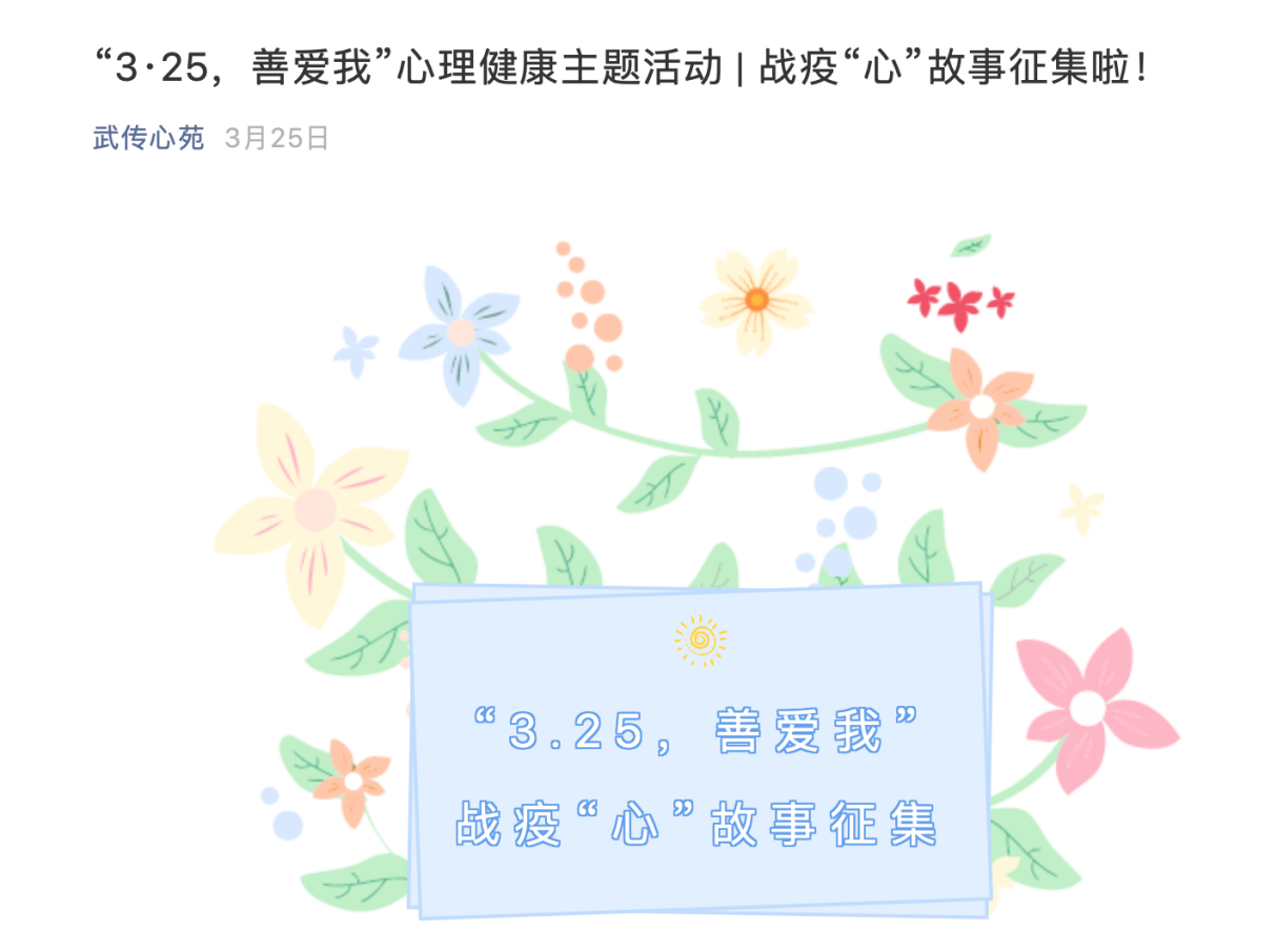 2020年3月25日-4月15日,伟德bv1946官网大学生心理健康教育中心开展“3·25,善爱我”心理健康主题活动——战疫“心”故事征集。本次活动旨在倡导大学生善待自我,关爱自我,怀着一份温暖,包容欣赏和接纳自己,传播抗疫期间的心理正能量。