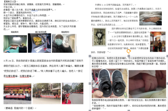 截至投稿日期,心理中心收到多份学生投稿,内容或是自己隔离在家的经历,或是加入志愿者工作的心得体会,或是和家人在一起的快乐生活,或是亲情带来的感悟与思考,亦或身边暖心的故事……经过悉心筛选,最终择优录取了十五位同学的战疫“心”故事,并分成三个系列,通过“武传心苑”微信公众号进行展示。