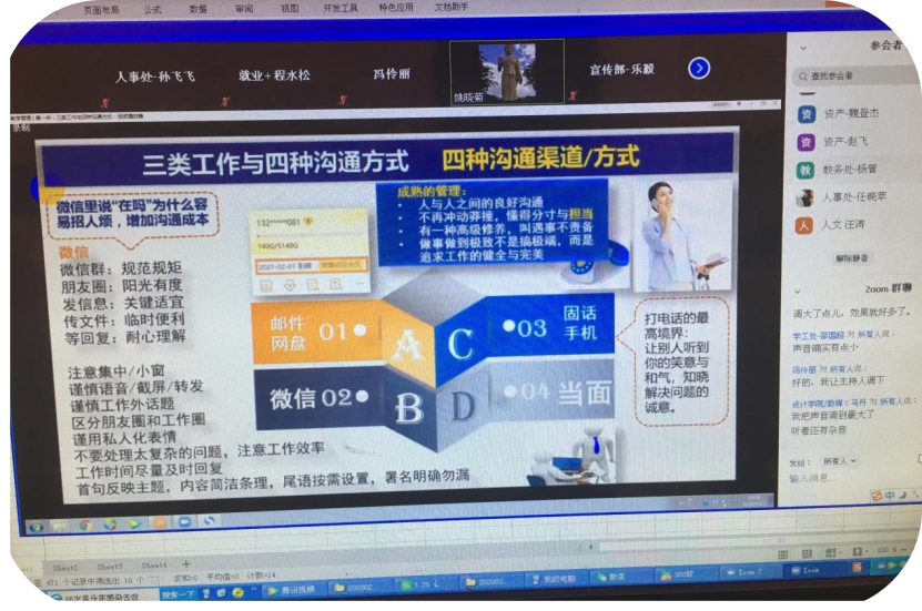 武传新闻网讯(文/记者 冯伶俐)3月25日晚,我们教师发展中心组织我们教学和行政管理干部在网上参加了《“三类工作”与“四类沟通方法”》公益直播培训,拉开了我们教学管理干部系列培训的序幕。本次培训由天津外国语大学国际商学院院长郭建校教授主讲。学校各学院党总支书记、教学副院长、教研室主任、教秘、行秘和全体行政职能部门副科级以上干部及教学管理相关人员100余人参加了本次培训。培训会议由学校校长助理、人事处(教师发展中心)姚晓菊主持。