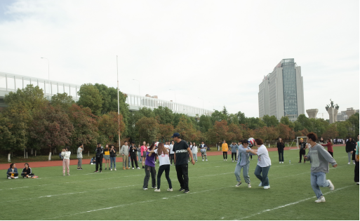 新闻传播学院第三组上场。记者看到,临上场前,队员们相互给对方加油;比赛开始,第一个出发的是小组组长王定为和组员郑辉,但他们出发十米左右掉了球,但他们迅速捡起再出发。继续行进一两步后,郑辉突然摔倒在地上,但他迅速爬起来继续前行。赛后,郑辉谈及摔倒的心情时,说道:“摔倒的时候没什么想法,就是想快点捡起球快点跑。”至于摔倒的原因,他分析道:“球已经掉过一次了,我怕落后,所以有点紧张,没注意脚下。”提到获得冠军,郑辉表示很感谢自己的队友,笑称多亏了这些队友,才能让他“躺赢”。