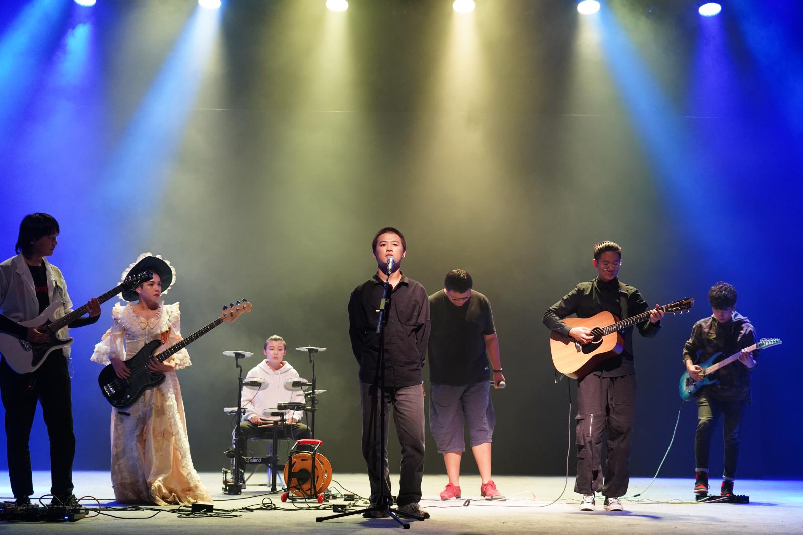 之后的表演来到了“飞扬”的部分。首先上台的是夺人眼球的新生辅导员走秀,他们穿着空姐服,古典服等等各色衣服,让大家眼前一亮。随后就是万众瞩目的板蓝根乐队和众筹乐队分别带来的《我的理想我做主》和《new boy》的表演,他们积极和台下观众互动,观众们闪烁的手机白灯,让整个会场都沉浸在欢乐的氛围中。