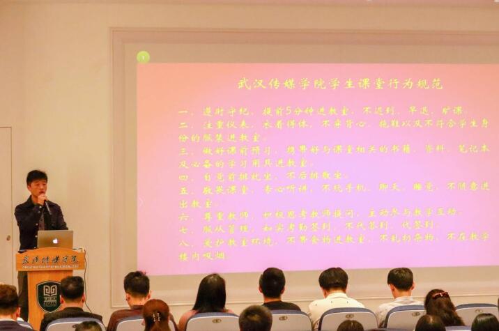最后,学生工作处处长张燕明致辞。他指出,此次会议对我们校风、学风建设统一思想、提高认识、凝聚人心,深刻领会“四个回归”具有重要的现实意义,并就如何回归常识,刻苦学习,争做新时代优秀大学生提出了三点建议:遵守规则,加强学风建设;脚踏实地,刻苦学习知识;树立理想,争做新时代优秀大学生,为实现中华民族伟大复兴奉献自己的力量。 接着,已考取武汉大学研究生的应届毕业生代表徐奇睿同学发言。她向大家分享了考研路上的心路历程,建议学弟学妹们把握现在的每分每秒,珍惜生活中每一个学习的机会,切勿将时间浪费在没有意义的事情上。电影与电视学院谢厚民同学作为在校生代表也向大家分享了几点体会。教师代表何卓伦老师作了以“强化课堂教学,践行立德树人”为主题的发言。他说到,教师要从重视教学、严格课堂管理、创新教学方法和手段、树立自身终身发展的理念这四个方面着手,强化课堂教学,落实立德树人根本任务。(学工处供稿)