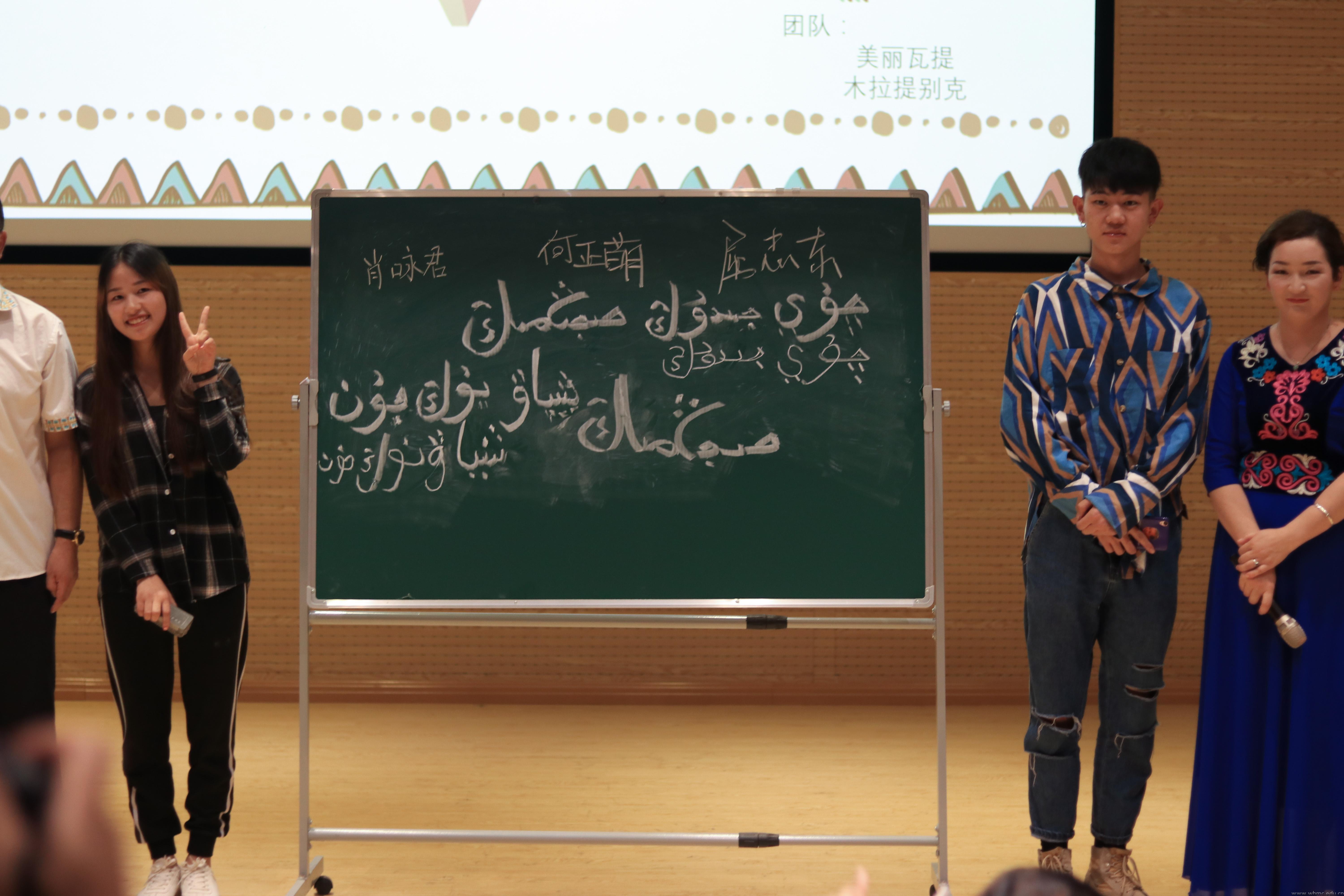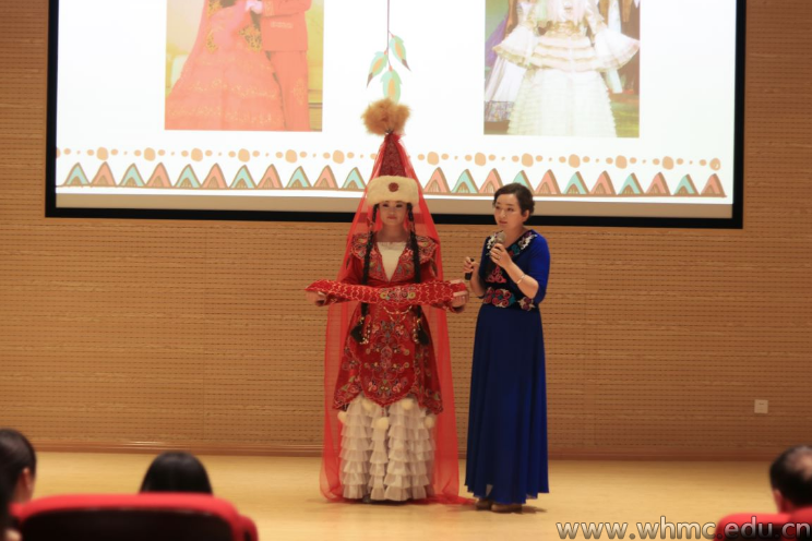 5月31日下午,“魅力阿克塞”交流讲座于圆形报告厅举行。研修班学员美丽瓦提为师生们讲解了阿克塞县的人文历史、特色服饰饮食和非遗文化。讲述民族特色服饰时,学员们现场展示了哈萨克族新娘服饰,美丽瓦提介绍说:“哈萨克族人结婚,新娘的服饰由其母亲缝制,伴娘由其嫂子担任,面纱是由司仪揭开,这与汉族有很大不同。”活动现场,3名同学在研修班学员的指导下,学习了各自姓名的哈萨克文字写法。