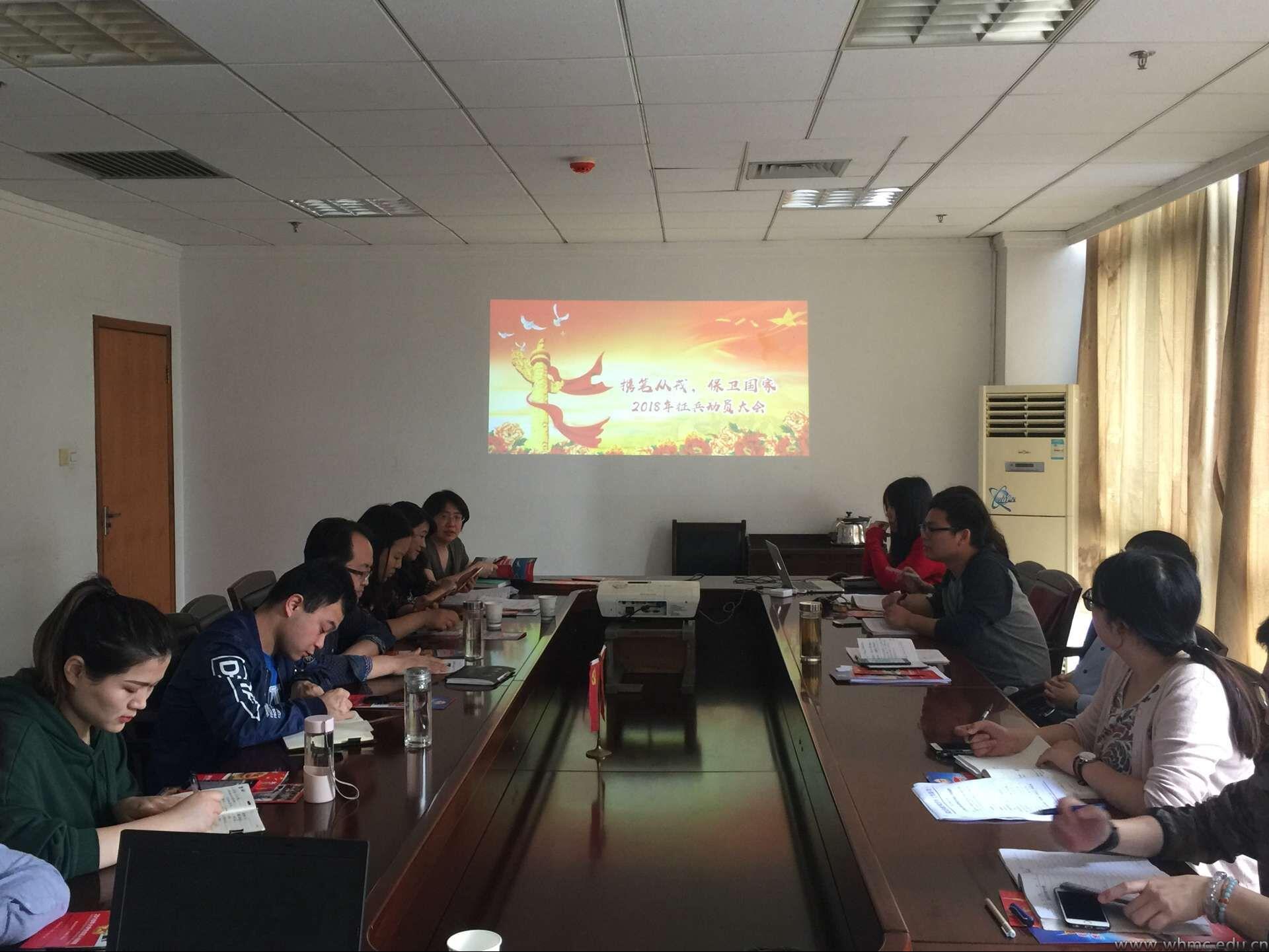 武传新闻网讯 为保证国家有关大学生应征入伍各项政策的全面落实,协调征兵工作进度,根据“2018全国大学生征兵工作网络视频会议”的精神,做好我们大学生应征入伍工作,5月10日上午9时,我们在行政楼414会议室举行“2018年征兵工作动员会”。常务副校长宗微、学生工作处处长兼武装部部长张燕明、教务处副处长姜虹,以及各学院党总支书记、团委书记参加了此次会议。