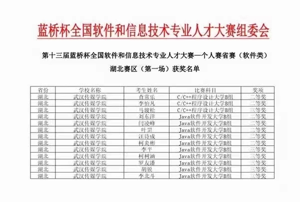 (武传新闻网讯 记者 骆博)近日,蓝桥杯大赛组委会公布“第十三届蓝桥杯全国软件和信息技术专业人才大赛省赛软件组”成绩,我们传媒技术学院共有13名学生获奖,其中二等奖7名,三等奖6名,实现了我们该项比赛获奖人数的新突破。