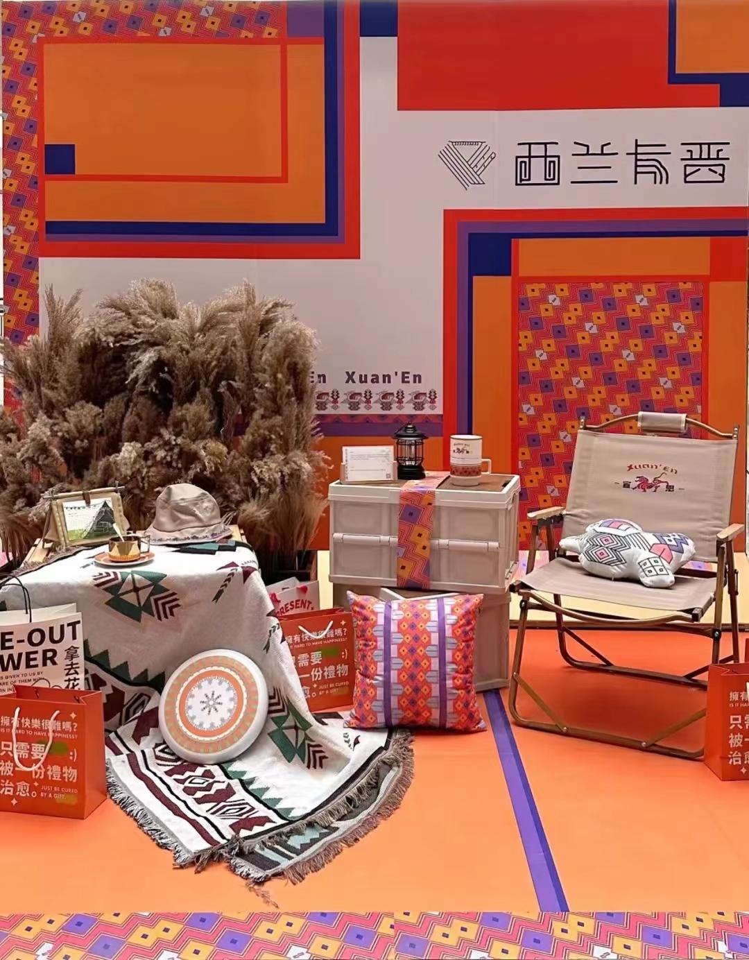 展览现场,陈列着一片以橙色为主的文创产品,文创形式包括口罩、帽子、手机壳等。据悉,这些文创产品的设计灵感来源于土家族特有的织锦——西兰卡普,而此次“匠心筑梦 美誉赋能”课程思政联展也是对乡村振兴背景下的西兰卡普的艺术传承进行创新思考,旨在活态传承湖北宣恩非遗文化,助推文旅融合,让教学成果和市场相互碰撞,实现“非遗创新传承+设计作品+产业融合”的教学新模式。