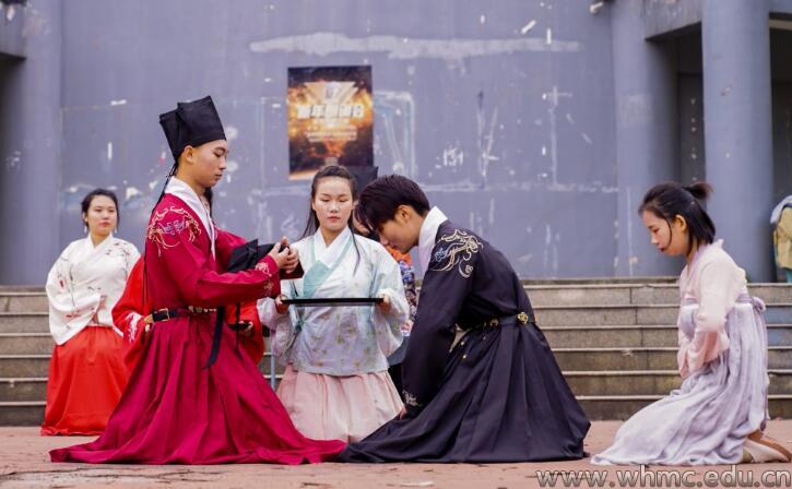 随着典雅庄重的古乐响起,男子及冠礼正式举行,9名身穿汉服的学生在司仪的引导下,跪地、加冠、聆讯、宣誓……,用中华民族传统的成人礼方式,宣告自己正式成年。“活动一方面是给新生的祝愿,另一方面也是为了弘扬传统文化。”活动负责人、青年志愿者协会副会长罗志怡说。