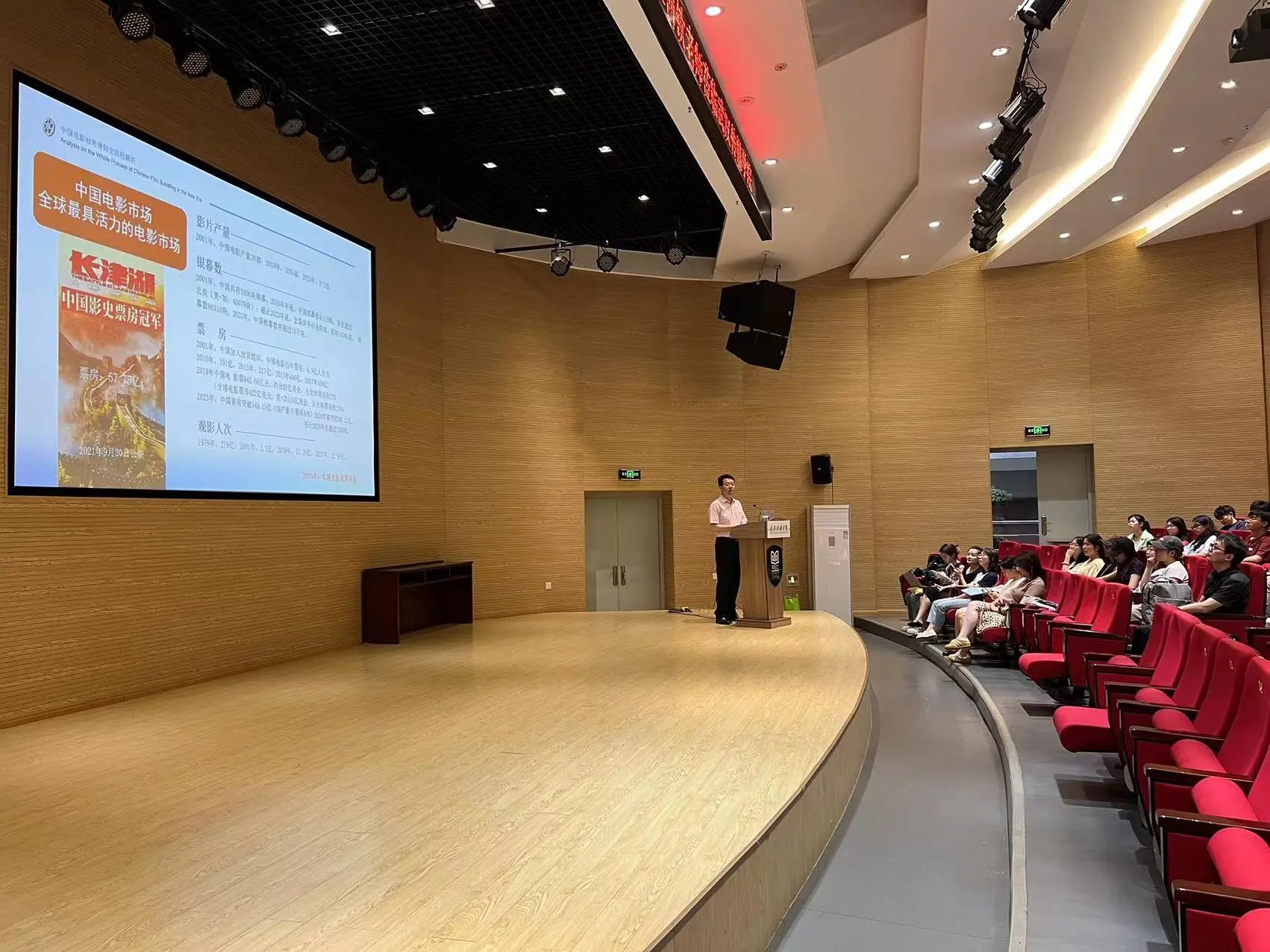 讲座伊始,何钦老师回顾了中国电影产业的发展历程和译制历史的变迁,在当前国际语境下,高质量的电影对外译制对中国电影“走出去”具有重要意义。随后,何老师深入分析了当前中国电影对外译制面临的挑战,并提出了相应的应对策略。他还对中国电影对外译制的流程,包括剧本翻译、配音演员选择、录音制作等环节进行了详细解析。
