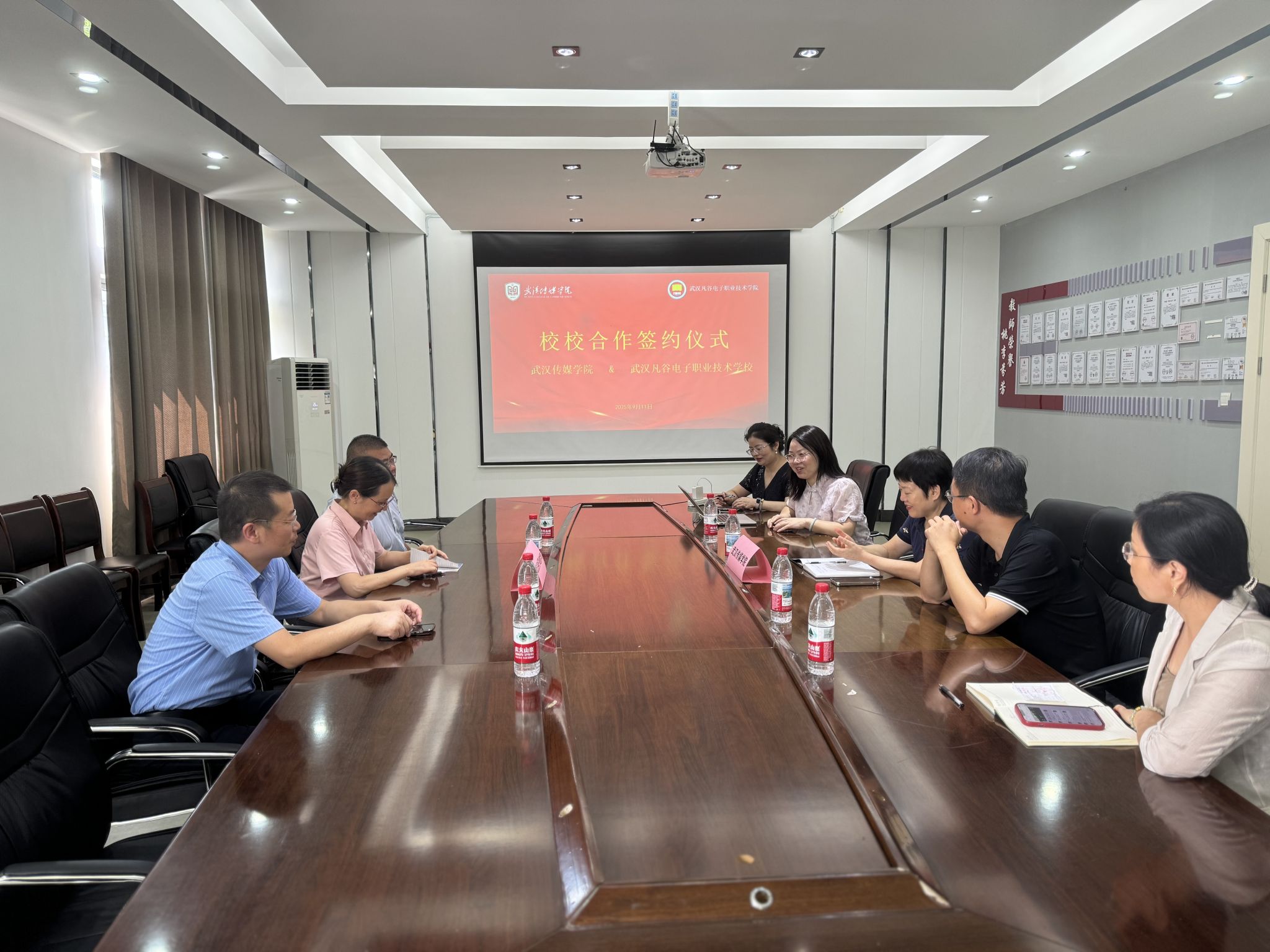 签约授牌环节后,双方围绕实习基地未来的具体运作模式、合作细节等进行了深入细致的交流。会议重点探讨了如何充分利用两校距离近的便利条件,设计更加灵活、高效的实习形式。双方尤其就今年11月我们人文与艺术学院2022级学生赴武汉凡谷电子职业技术学校开展实习工作的具体安排、内容设计、指导方式与学生管理等方面进行了务实且细致的探讨,并初步形成了系统性的合作框架。武汉凡谷电子职业技术学校方面对此高度重视,表示将基于此前接收实习生的良好经验,全力提供更优质的实践平台、完善的指导流程和必要的支持保障,确保本轮实习工作顺利、高效开展,让学生真正受益。