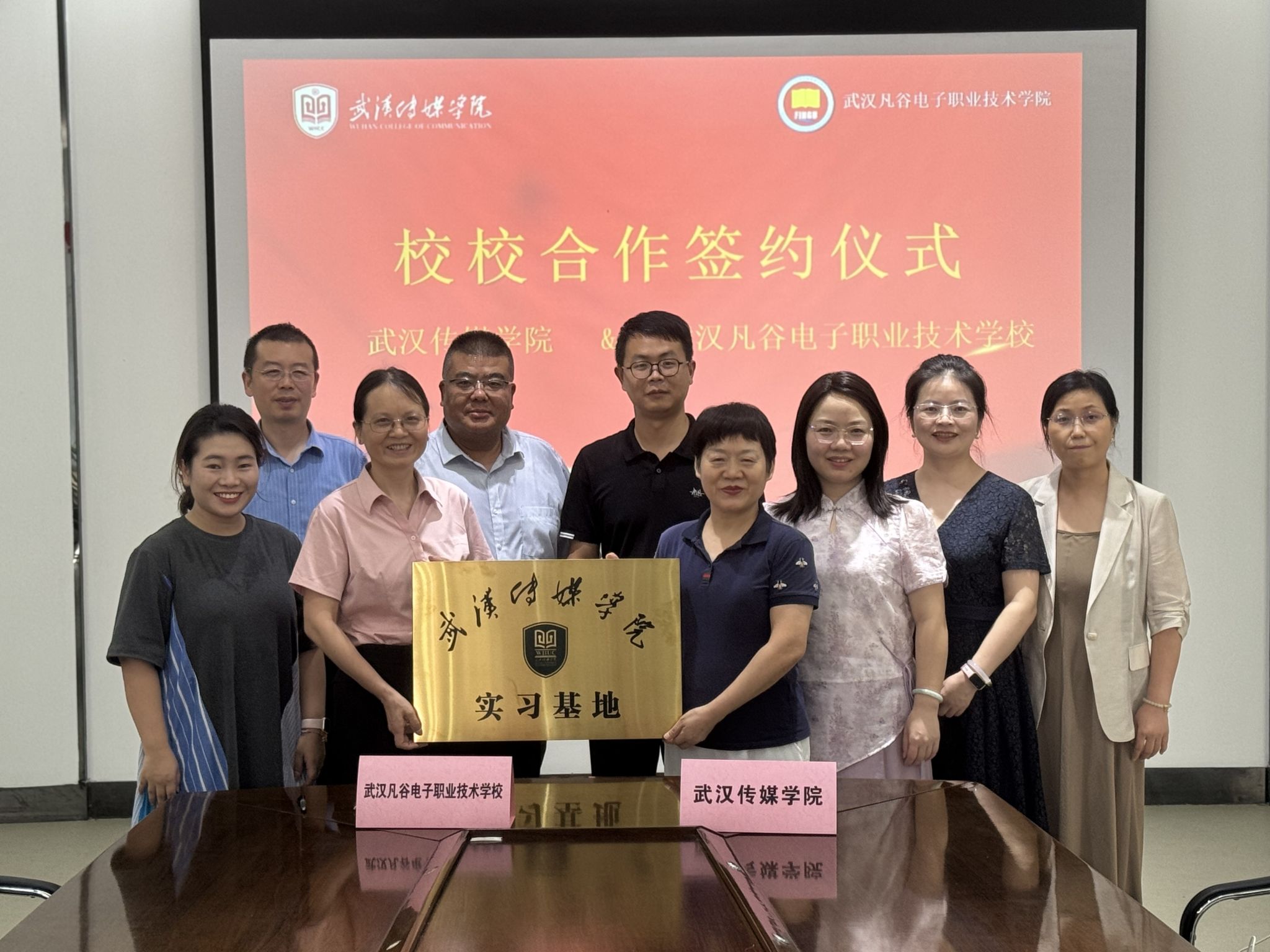 我们人文与艺术学院党总支部书记吴斌、院长盛银花、副院长陶立军,以及中文教研室专业带头人张艳彬、教研室主任白云玲;武汉凡谷电子职业技术学校校长李艳华、副校长陈圣军、买绘涛,及教务主任汪菁华,共同出席了本次签约授牌仪式。
